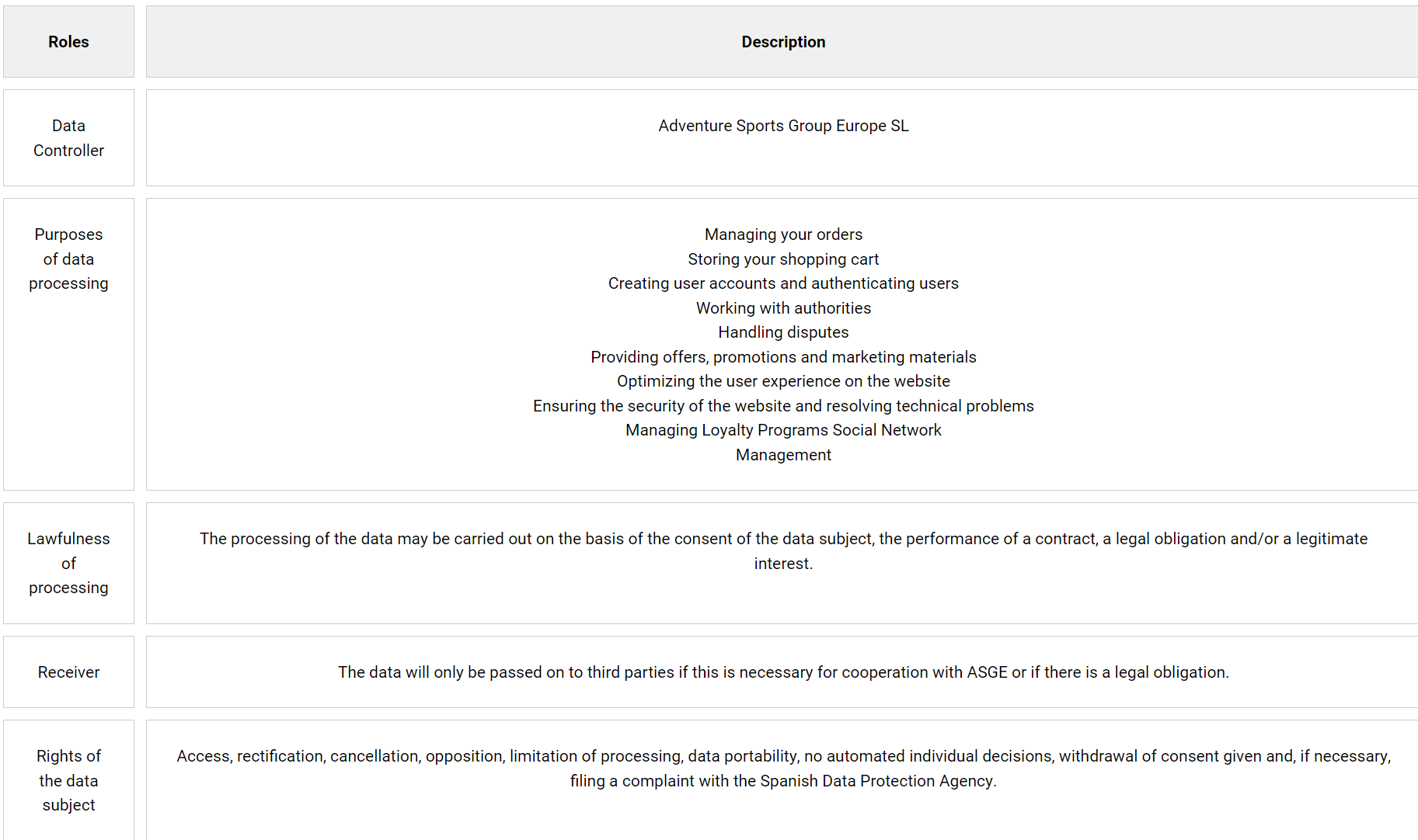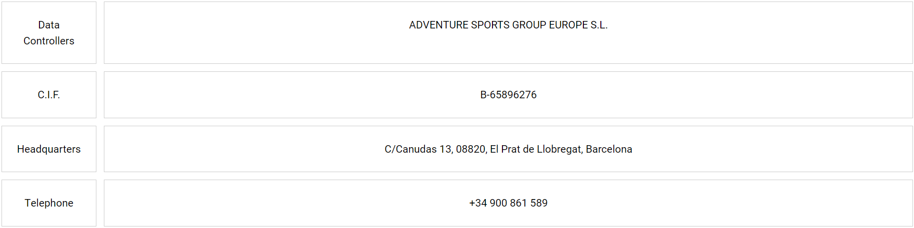 Any person who provides their data through the forms on this website and consents to their processing declares that they are over 14 years of age and acknowledges that access to and use of the portal by minors under this age is prohibited. If at any time the data controller determines that a minor under the age of 14 has submitted personal data, we will delete it. In any case, parents or guardians have the option of contacting ADVENTURE SPORTS GROUP EUROPE S.L.U. to block the access account of minors entrusted to them who have been registered with a forged identity.