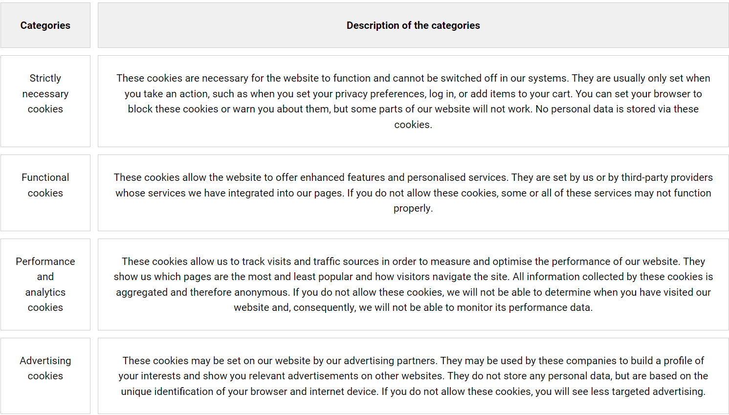 Unless otherwise stated, we use the following cookies on our websites: